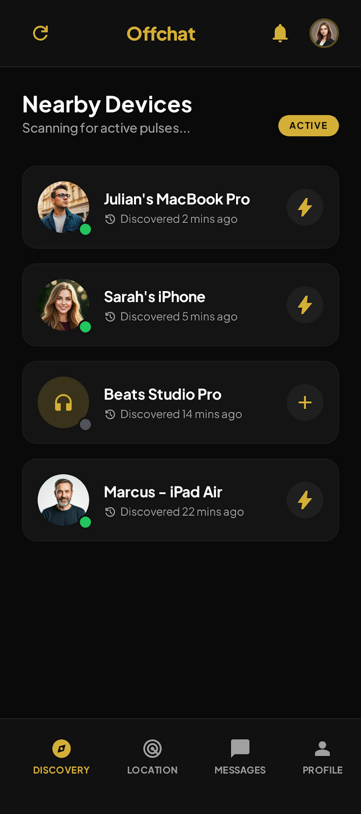 The main interface scans for nearby active pulses. Discovered users appear with their custom aliases and proximity status.