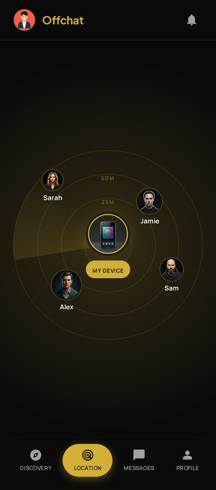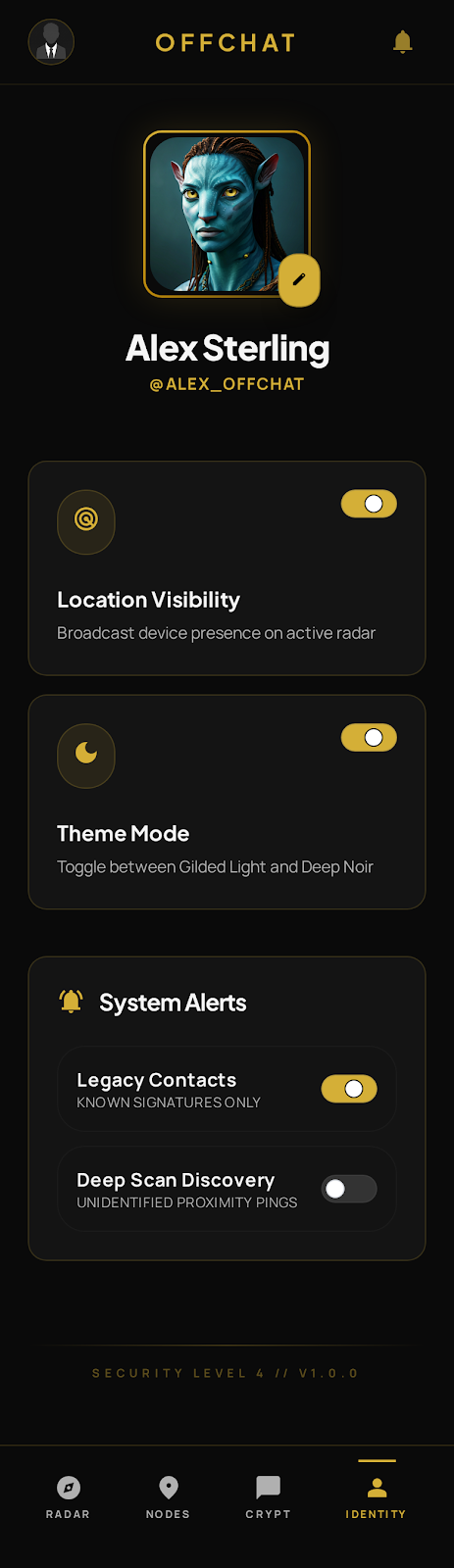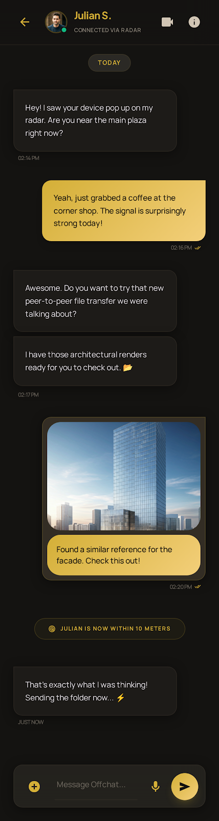 Off Chat is an offline-first, peer-to-peer communication platform built with Flutter. It utilizes Bluetooth Low Energy (BLE) to enable device discovery, relative location tracking (Radar), and secure messaging without any reliance on internet or cellular connectivity.